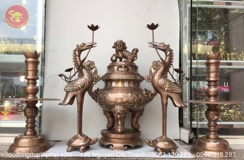 Chi tiết nổi bật: Đỉnh đồng được khảm long phụng, tạc nghê đồng uy nghiêm. Trên đỉnh được khảm 5 chữ nôm thư pháp theo thứ tự Phúc – Lộc – Thọ - Khang – Linh trong đó có chữ Thọ được khảm bằng vàng 9999 và 4 chữ Phúc - Lộc – Khang - Linh được khảm bạc nguyên chất. Mặt sau 3 chữ Đức – Lưu – Quang được khảm bạc nguyên chất.